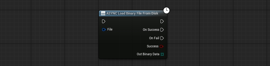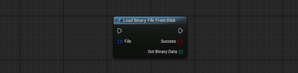 Warning: Previewing the "Out Binary Data" array may cause lag. The array can be extremely large, depending on the file size. This node lets you load any binary file from your machine into Unreal Engine as a binary array.